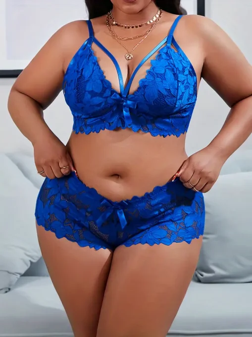 Ensemble de lingerie sexy grande taille en dentelle, composé de deux pièces avec appliques florales et nœud papillon. Confortable et élégant, idéal pour sublimer votre silhouette. Livraison rapide en 5 jours ouvrés.